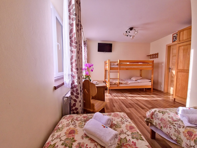 4 łóżka w tym 2 pojedyncze i 2 piętrowe/ 1 łazienka