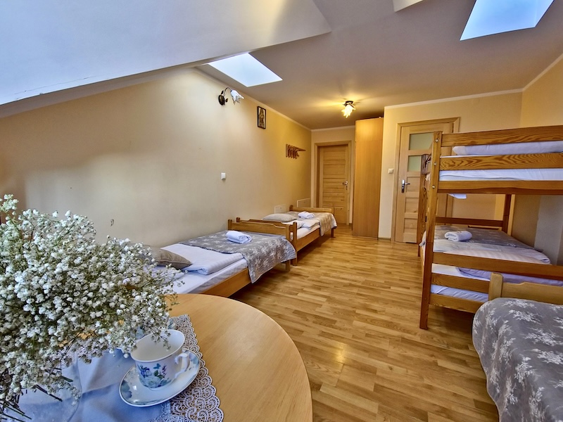 5 łóżek w tym 3 pojedyncze łóżka, 2 łóżka piętrowe/ 1 łazienka