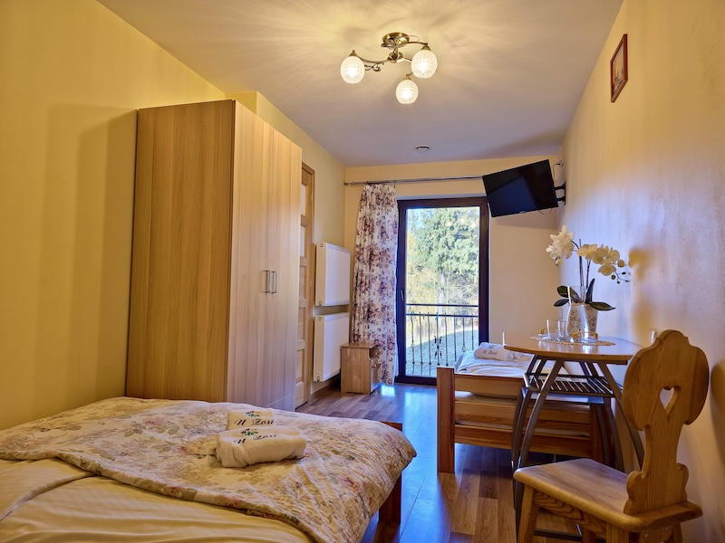 2 łóżka w tym 1 małżeńskie /1 łazienkaElegancki pokój z wygodnym łóżkiem małżeńskim i dodatkowym miejscem noclegowym.